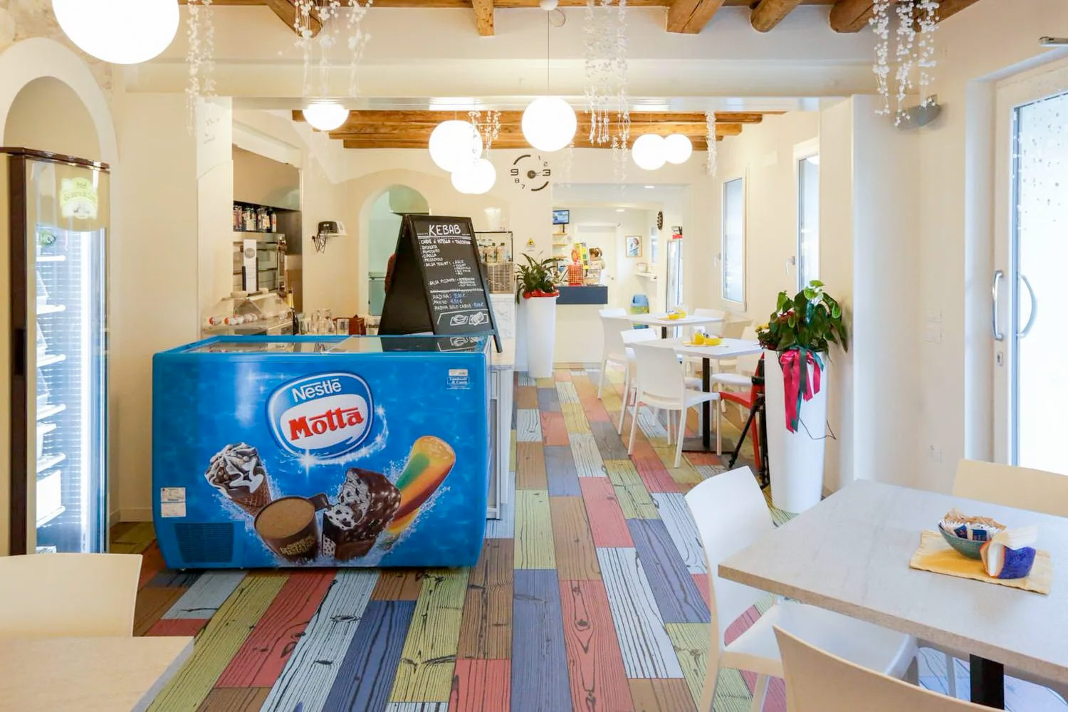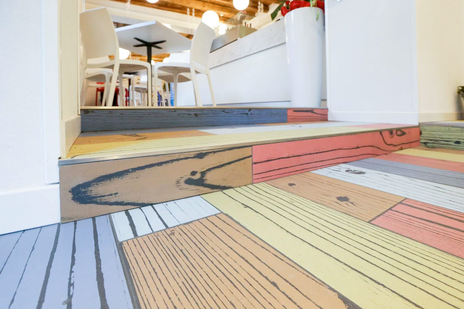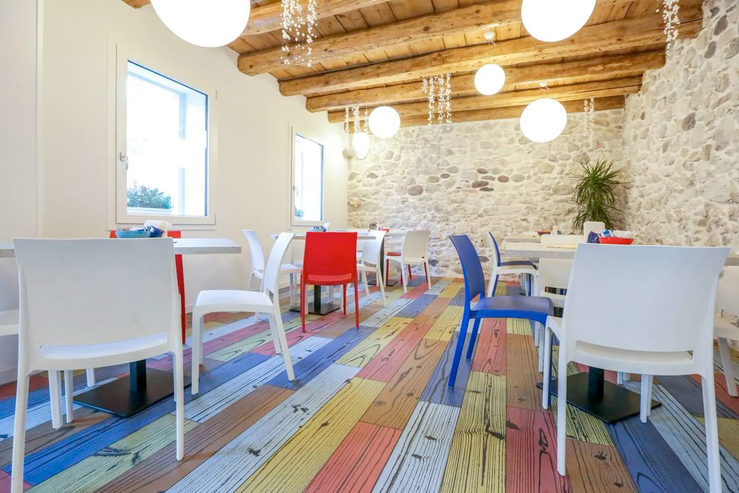 Superfici Forlin ha curato l’intero progetto, selezionando con attenzione i materiali e combinando sapientemente gli elementi colorati per creare un effetto di forte impatto visivo.