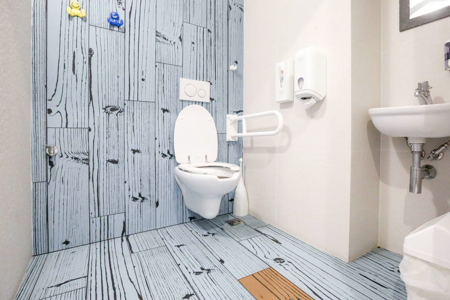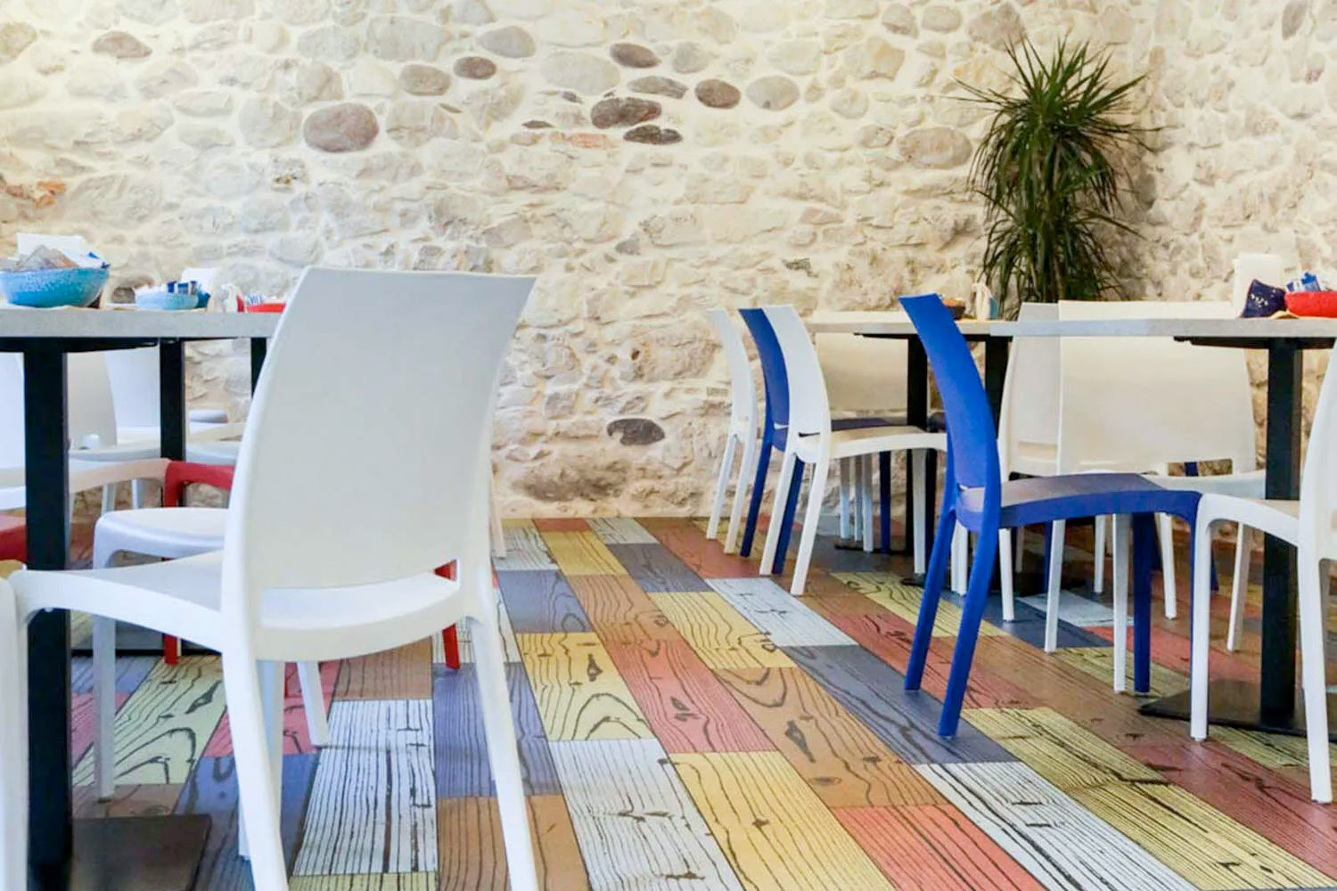 Progettazione e posa in opera di pavimento in gres porcellanato effetto legno colorato e dei rivestimenti effetto pietra.